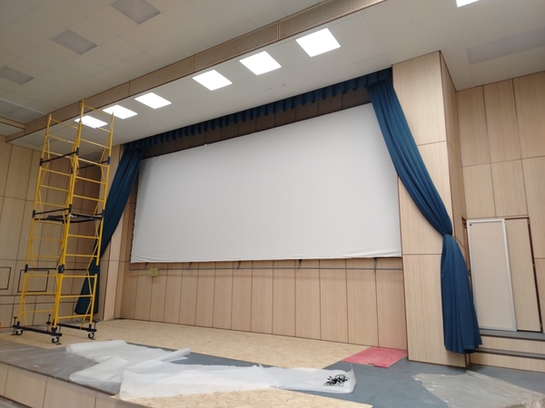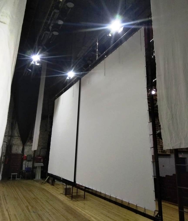 По ширине - полотно может быть любого разумного размера. Но обычно речь идет о форматах экранов 16*9 и 2,35*1 (это - стандарт для кинозалов).